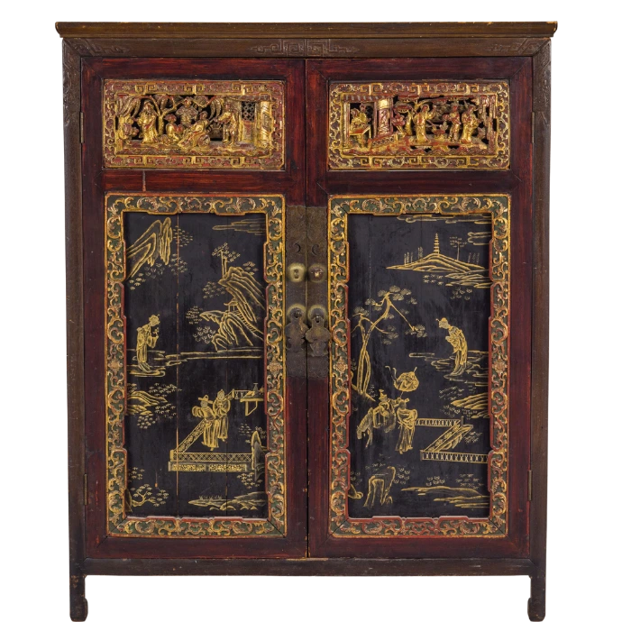 Bella credenza cinese, realizzat a cavallo tra il XIX ed il XX secolo, in legno intagliato e laccato e dorato.